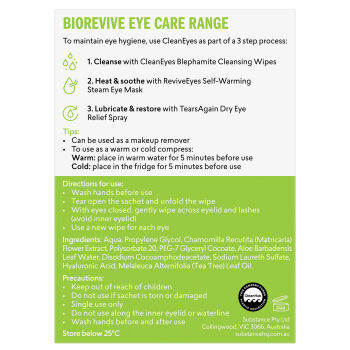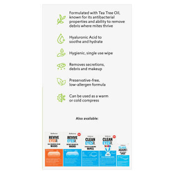 CleanEyes Blephamite Cleansing Wipes are specially formulated with Tea Tree Oil and soothing ingredients to help cleanse, hydrate and refresh irritated eyelids. Designed to remove debris, secretions, and impurities, they support eyelid hygiene and leave the delicate eye area feeling calm and revitalised. Ideal for those prone to Blepharitis, dry eyes, or eyelid irritation.