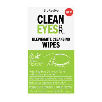 CleanEyes Blephamite Wipes are preservative-free cleansing wipes infused with Tea Tree Oil, hyaluronic acid, chamomile and aloe vera. They gently remove crust, residue and debris that can build up along the eyelid margins, while hydrating and soothing sensitive skin. The are single-use, hygienic, and convenient for daily eye care or makeup removal.