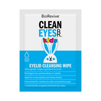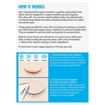 CleanEyes Kids Wipes are ultra-gentle eyelid cleansing wipes specially formulated for newborns, babies and children. Each sterile wipe is soaked in a preservative-free saline solution to help remove secretions, crust, discharge, dust and everyday debris that may irritate delicate eyes.