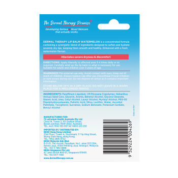 Experience the refreshing burst of Dermal Therapy Lip Balm Watermelon Stick, designed to deeply hydrate and soothe dry, chapped lips. This ultra-moisturising formula delivers visible results in just one day, leaving lips soft, smooth, and nourished with a fresh watermelon flavour in an easy to use twist up stick.